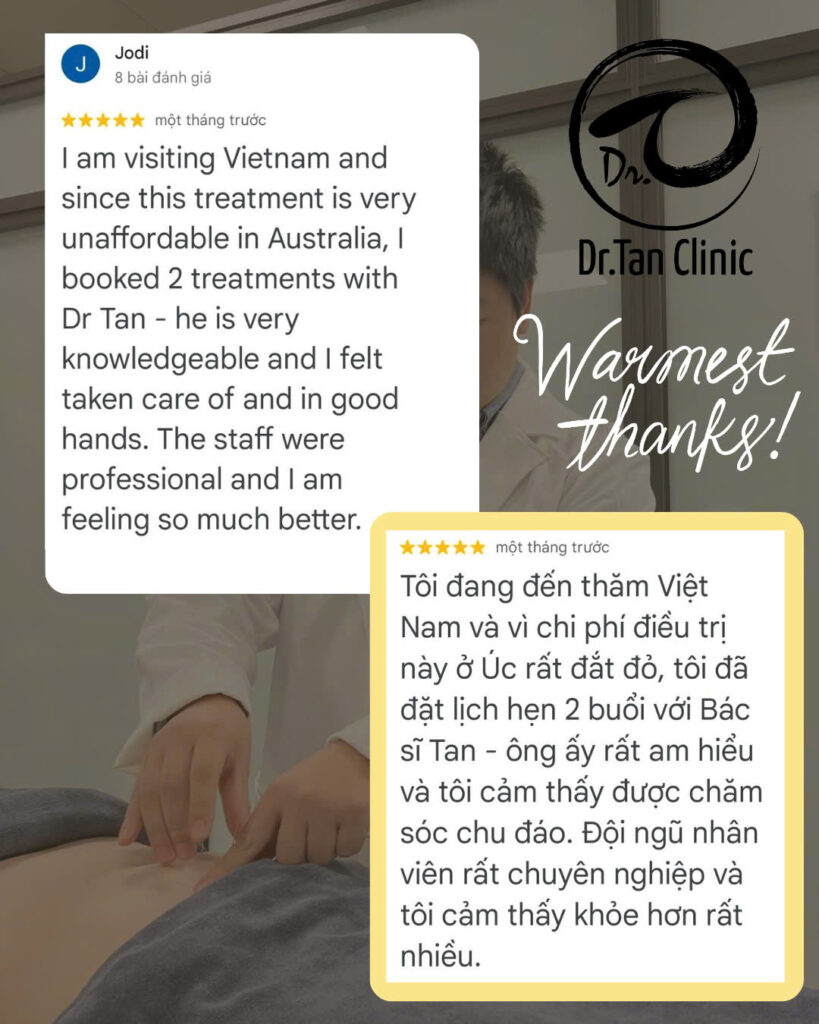 Đừng để những cơn đau mỏi làm gián đoạn cuộc sống của bạn! Hãy đặt lịch tư vấn và trải nghiệm ngay liệu trình trị liệu Đông y chuyên sâu tại Dr. Tan Clinic hôm nay.