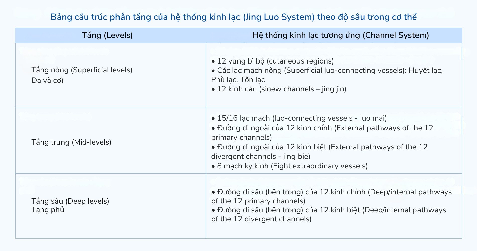 Cấu trúc phân tầng này giúp Khí và Huyết lưu thông trơn tru từ nông đến sâu, từ đó duy trì sự hài hòa giữa cơ thể vật lý và năng lượng sinh học.